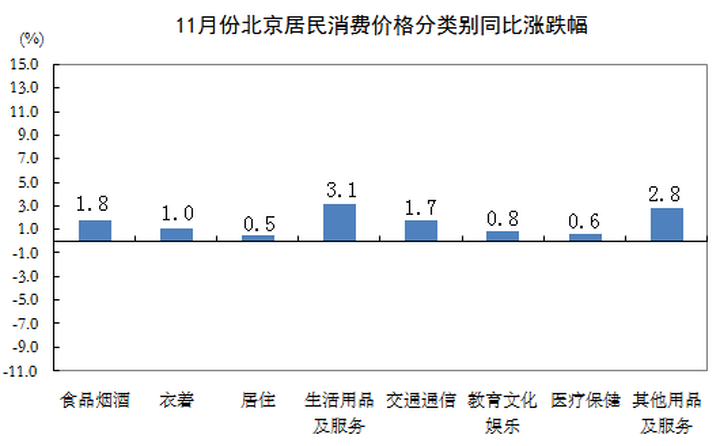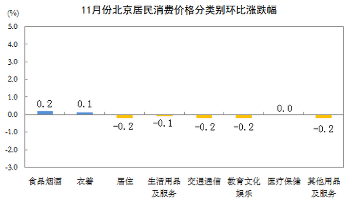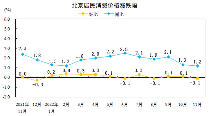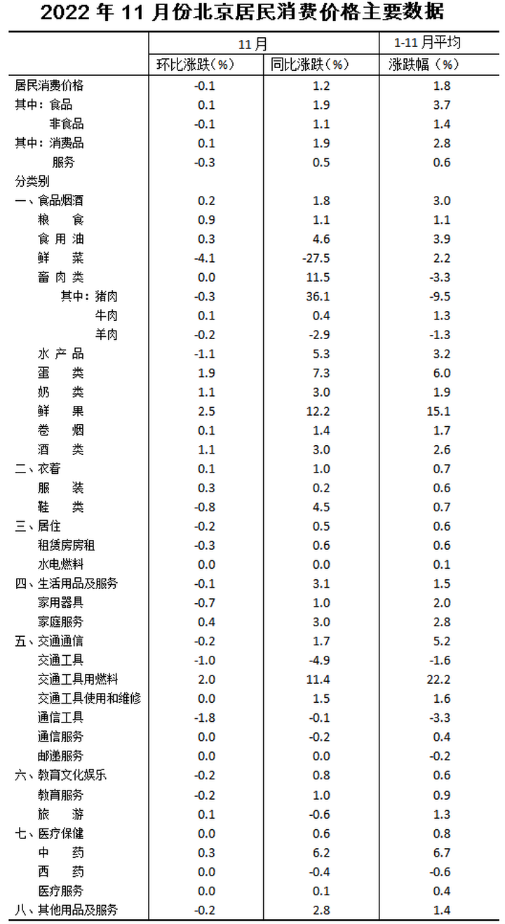 近日,北京市统计局发布2022年11月份北京居民消费价格变动情况。数据显示,11月份,北京居民消费价格环比下降0.1%,其中,居住价格下降0.2%;北京居民消费价格同比上涨1.2%,其中,居住价格上涨0.5%。1-11月份,北京居民消费价格总水平比上年同期上涨1.8%。这说明,北京的房租在下跌,而且跌幅比居民消费价格还多0.1%。再过几天70城数据出台,估计北京房价也要环比下跌了。11月份,食品烟酒价格环比上涨0.2%,影响总指数上涨约0.04个百分点。食品中,鲜果价格上涨2.5%,影响总指数上涨约0.06个百分点;蛋类价格上涨1.9%,影响总指数上涨约0.01个百分点;畜肉类价格持平,其中猪肉价格下降0.3%;鲜菜价格下降4.1%,影响总指数下降约0.07个百分点。其他七大类价格环比一升五降一平。其中,衣着价格上涨0.1%,居住、交通通信、教育文化娱乐和其他用品及服务价格均下降0.2%,生活用品及服务价格下降0.1%,医疗保健价格持平。11月份,食品烟酒价格同比上涨1.8%,影响总指数上涨约0.41个百分点。食品中,鲜果价格上涨12.2%,影响总指数上涨约0.26个百分点;畜肉类价格上涨11.5%,影响总指数上涨约0.29个百分点,其中猪肉价格上涨36.1%,影响总指数上涨约0.26个百分点;蛋类价格上涨7.3%,影响总指数上涨约0.04个百分点;水产品价格上涨5.3%,影响总指数上涨约0.05个百分点;鲜菜价格下降27.5%,影响总指数下降约0.62个百分点。其他七大类价格同比均上涨。其中,生活用品及服务、其他用品及服务、交通通信、衣着价格分别上涨3.1%、2.8%、1.7%和1.0%,教育文化娱乐、医疗保健和居住价格分别上涨0.8%、0.6%和0.5%。