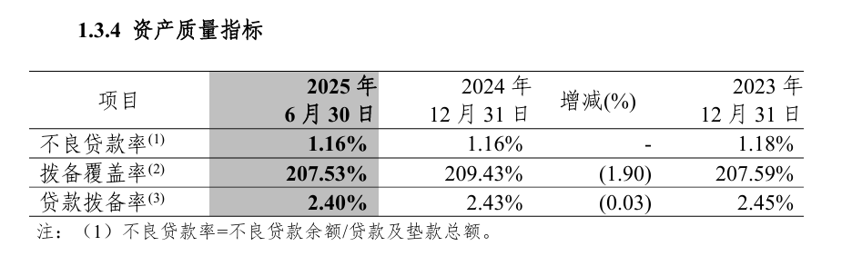 信用减值敢“瘦身”,源于资产质量的稳定托底。截至6月末,不良贷款率持续稳定在1.16%,与2024年末持平;不良贷款余额微增至671.34亿元,是贷款总规模从5.72万亿元增长至5.8万亿元的自然结果,不良资产“成色”未现明显恶化。