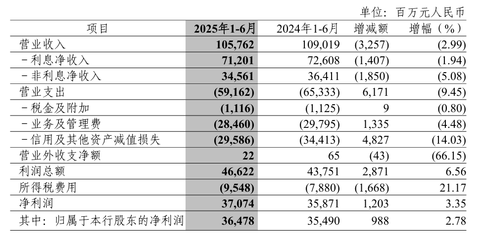 业绩数据显示,该行上半年实现营业收入1057.6亿元,同比下降3%;归属于母公司股东的净利润364.8亿元,同比增长2.8%,其中二季度单季净利润同比增速提升至4.1%。