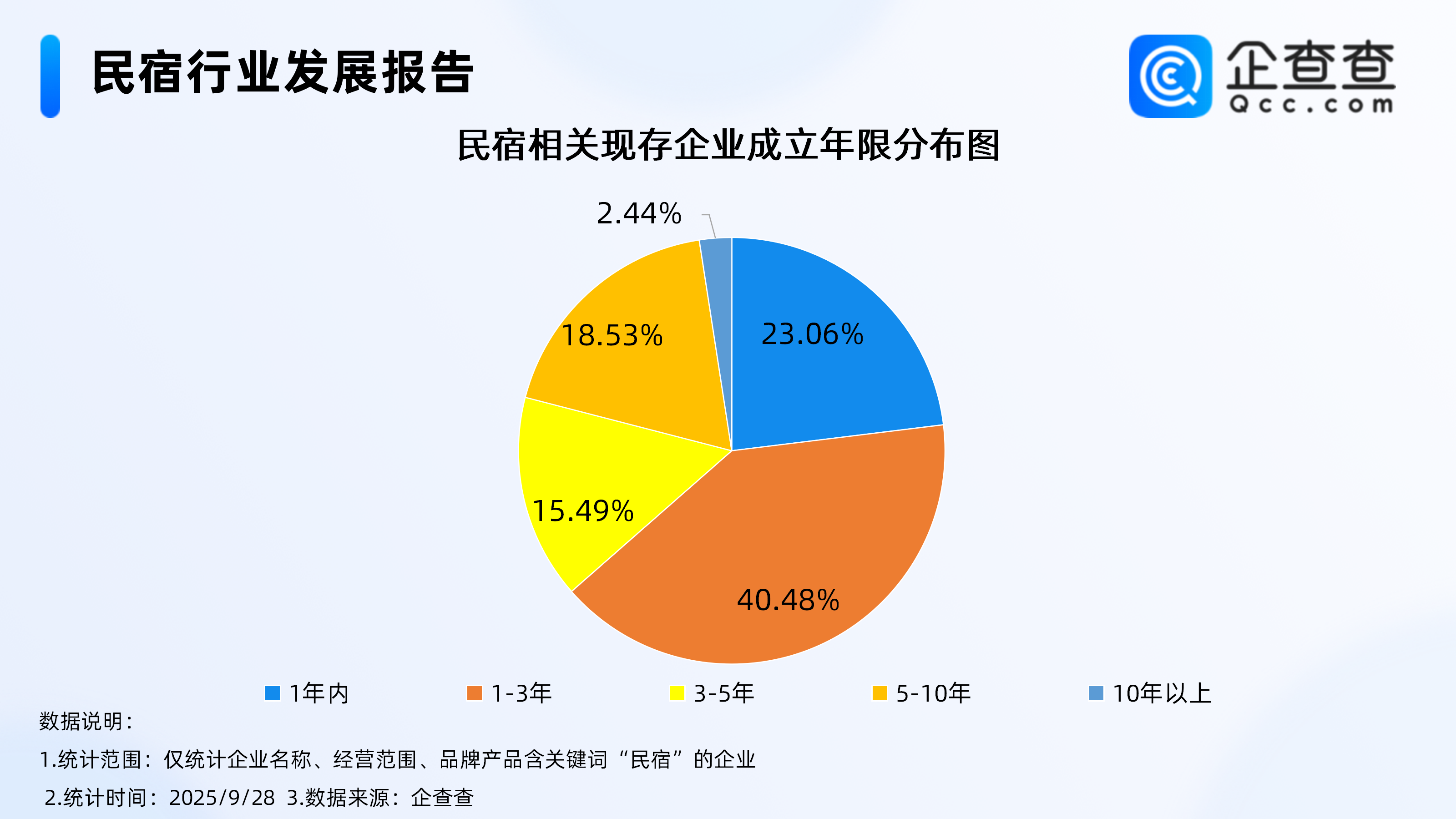 企查查数据显示,成立年限分布上,国内民宿相关现存企业中,超6成相关企业成立于近三年,其中成立年限在1-3年的企业最多,占比达40.48%,成立于1年内的相关企业,占比达23.06%。