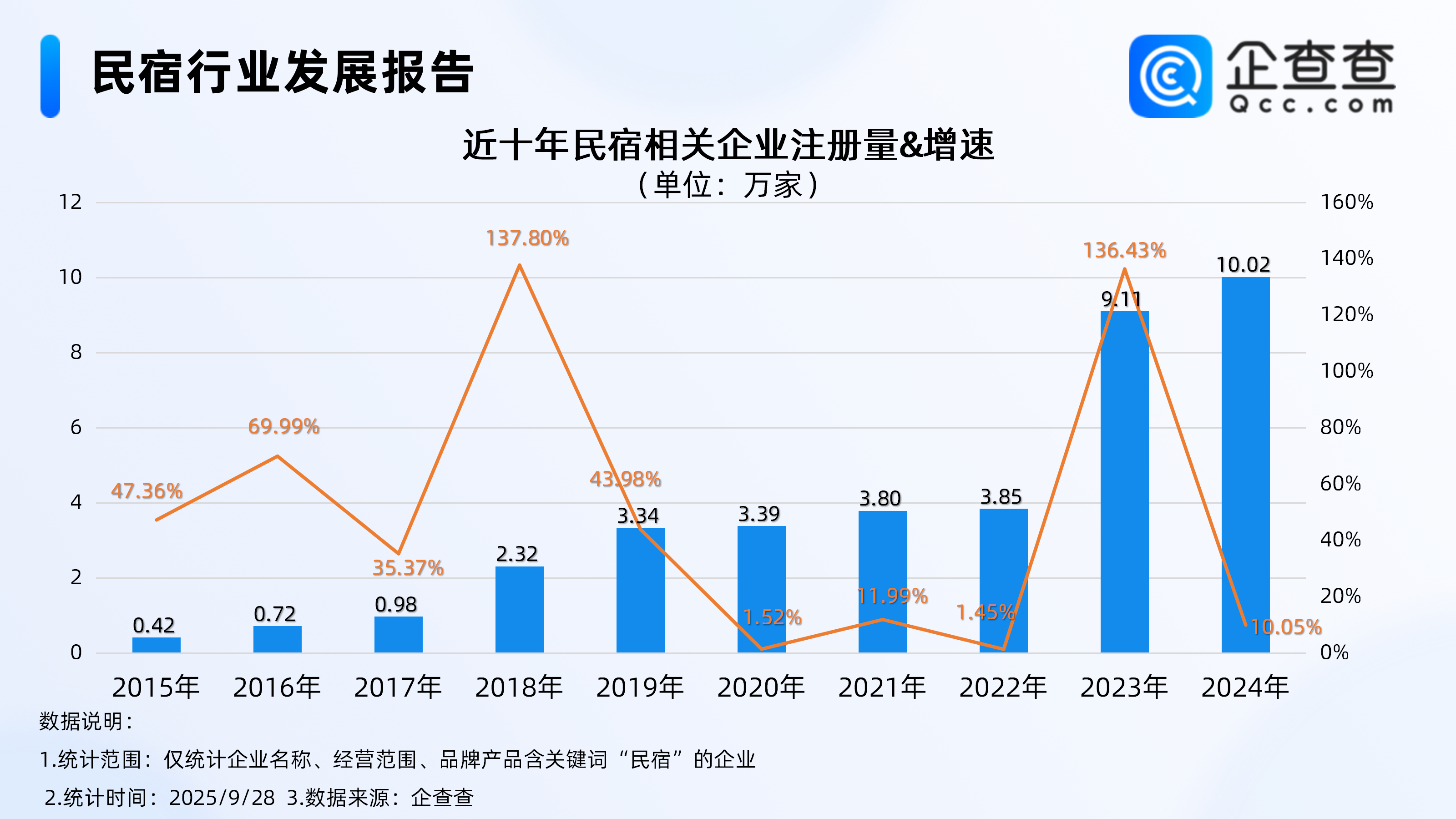 企查查数据显示,注册量方面,近十年民宿相关企业年注册量呈逐年增长趋势,2024年注册量首次突破10万家,达10.02万家,截至目前今年已注册6.73万家。