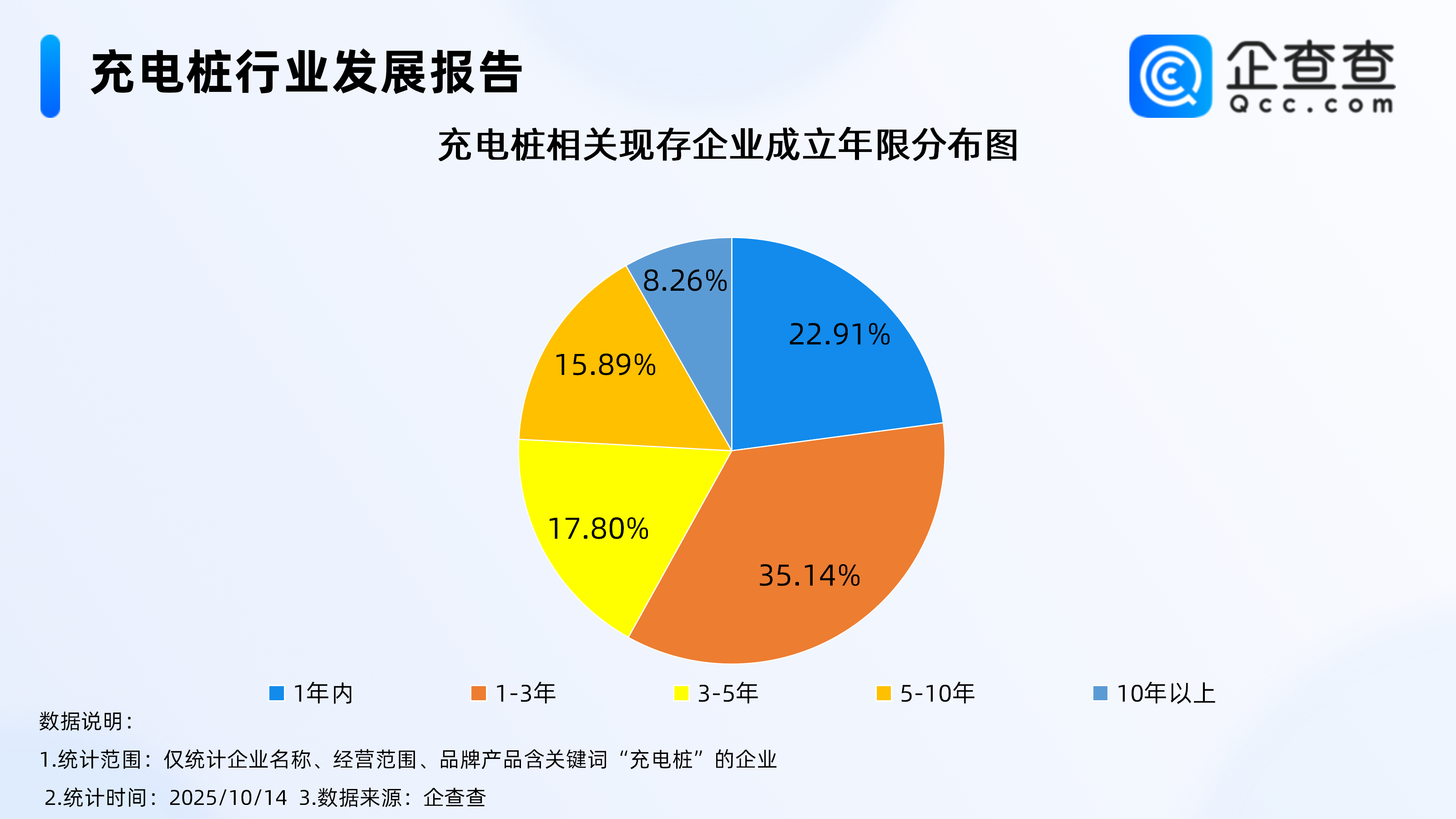 企查查数据显示,从成立年限上看,国内充电桩相关现存企业中,近6成相关企业成立于近3年,其中成立年限在1-3年的相关企业最多,占比达35.14%,成立于1年内的相关企业占比达22.91%。