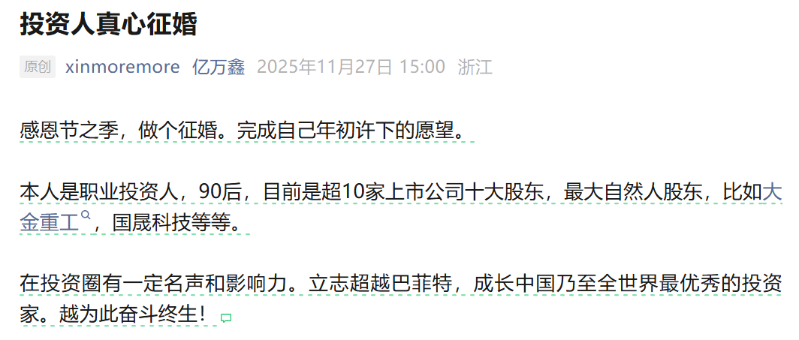 据说,征婚的效果也立竿见影,刘鑫的微信每天收到数百个好友申请,让他应接不暇。不过,对金融圈而言,关注的焦点很快从征婚本身转移到了他背后的财富实力上,特别是他提到的“超10家上市公司十大股东”身份。