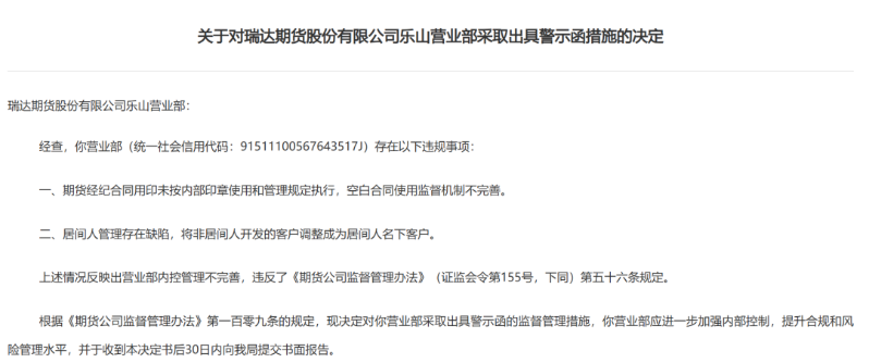近日,四川证监局公告,对瑞达期货股份有限公司乐山营业部出具警示函。
