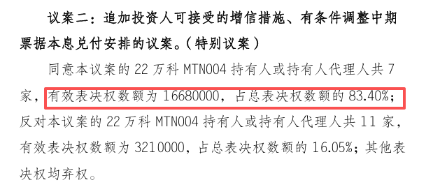 剩余一项议案主要调整原利息至2025年12月15日正常兑付,并提供相对应增信措施,但未明确具体增信安排。最终该议案仅获得18.95%同意率。