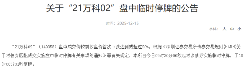 鉴于上述债券未能展期,资本市场对万科的预期也开始转为悲观。截至12月15日午盘,万科A(SZ:000002)收跌2.19%,报4.91元;万科企业(HK:02202)则收跌3.80%,报3.54港元。同时,“21万科02”因盘中成交价首次下跌达到或超过20%触发临停。