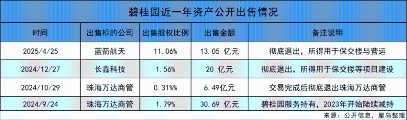 据《星岛》不完全统计,从2024年12月至今,碧桂园公开披露出售的战略投资性股权资产总计已超60亿元,如20亿出售长鑫科技约1.56%股权、13.05亿元出售蓝箭航天约11.063%股份等。