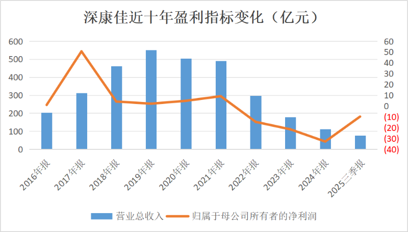 业绩数据显示,深康佳在2019年营收达到峰值551.19亿元,此后逐年走低;自2022年起,公司归母净利润持续为负。更为严峻的是,该公司自2011年以来连续14年扣非归母净利润为负,2025年前三季度为-15.22亿元。