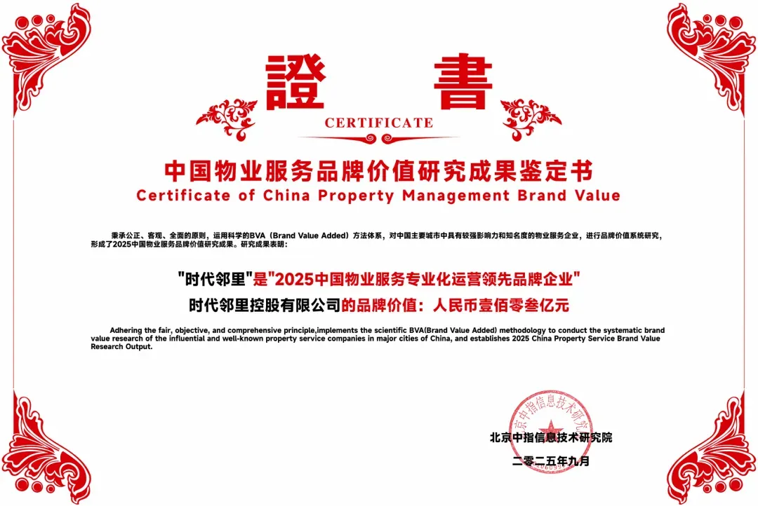 9月11日,时代邻里荣膺“2025中国物业服务专业化运营领先品牌企业”,品牌价值再创新高,达到103亿元。