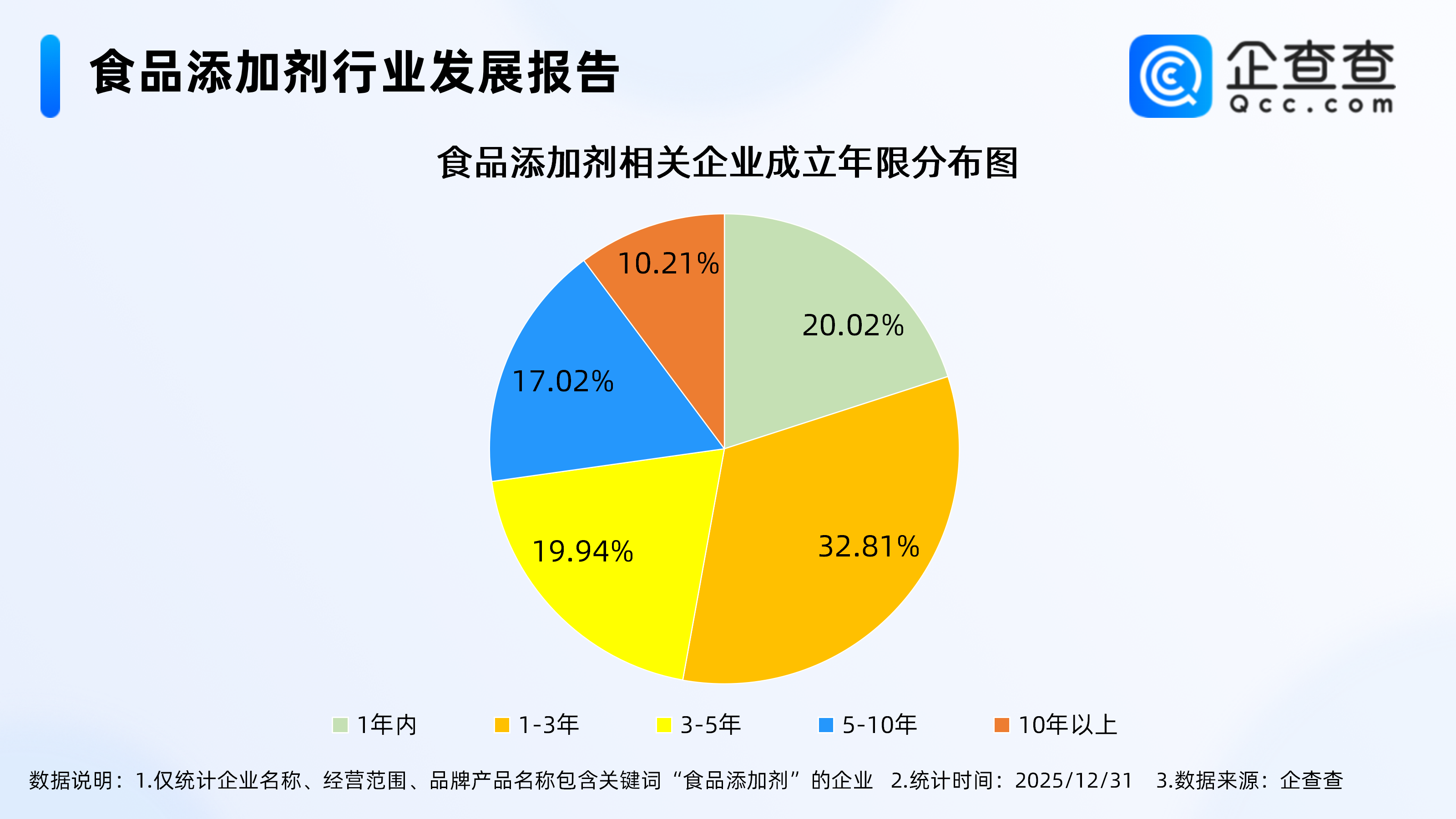 企查查数据显示,从经营时间来看,食品添加剂相关现存企业主要成立于近三年,成立年限在1-3年的相关企业占比32.81%。其次,成立年限在1年内的相关企业占比20.02%。