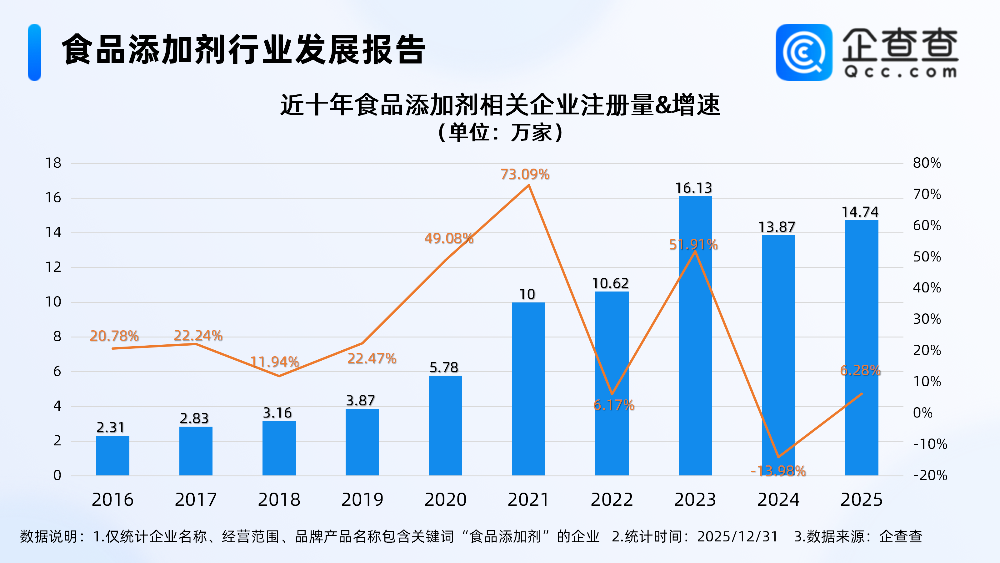 企查查数据显示,截至2025年12月31日,国内现存食品添加剂相关企业69.98万家。近十年相关企业注册量呈整体增长态势,其中2023年全年注册16.13万家相关企业,同比增长51.91%,达近十年注册量峰值。2025年全年注册14.74万家食品添加剂相关企业,同比增长6.28%。