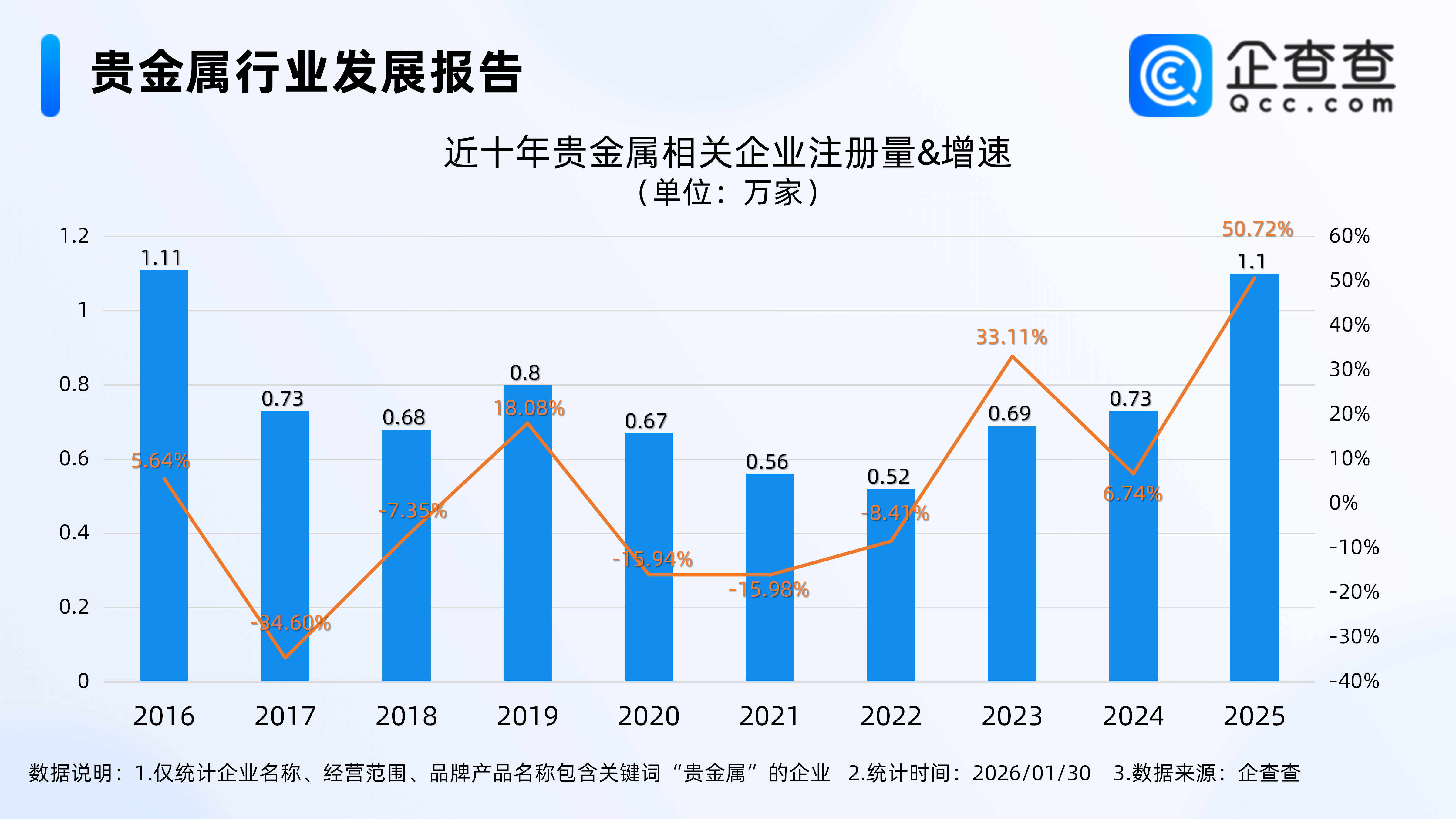 企查查数据显示,截至1月30日,国内现存贵金属相关企业6.49万家。近十年相关企业注册量呈上下波动态势,自2023年起相关企业注册量连年增长,2023年、2024年分别同比增长33.11%、6.74%至0.69万家、0.73万家。2025年全年注册量重回万家,同比增长50.72%至1.1万家。截至目前,今年已注册0.11万家。