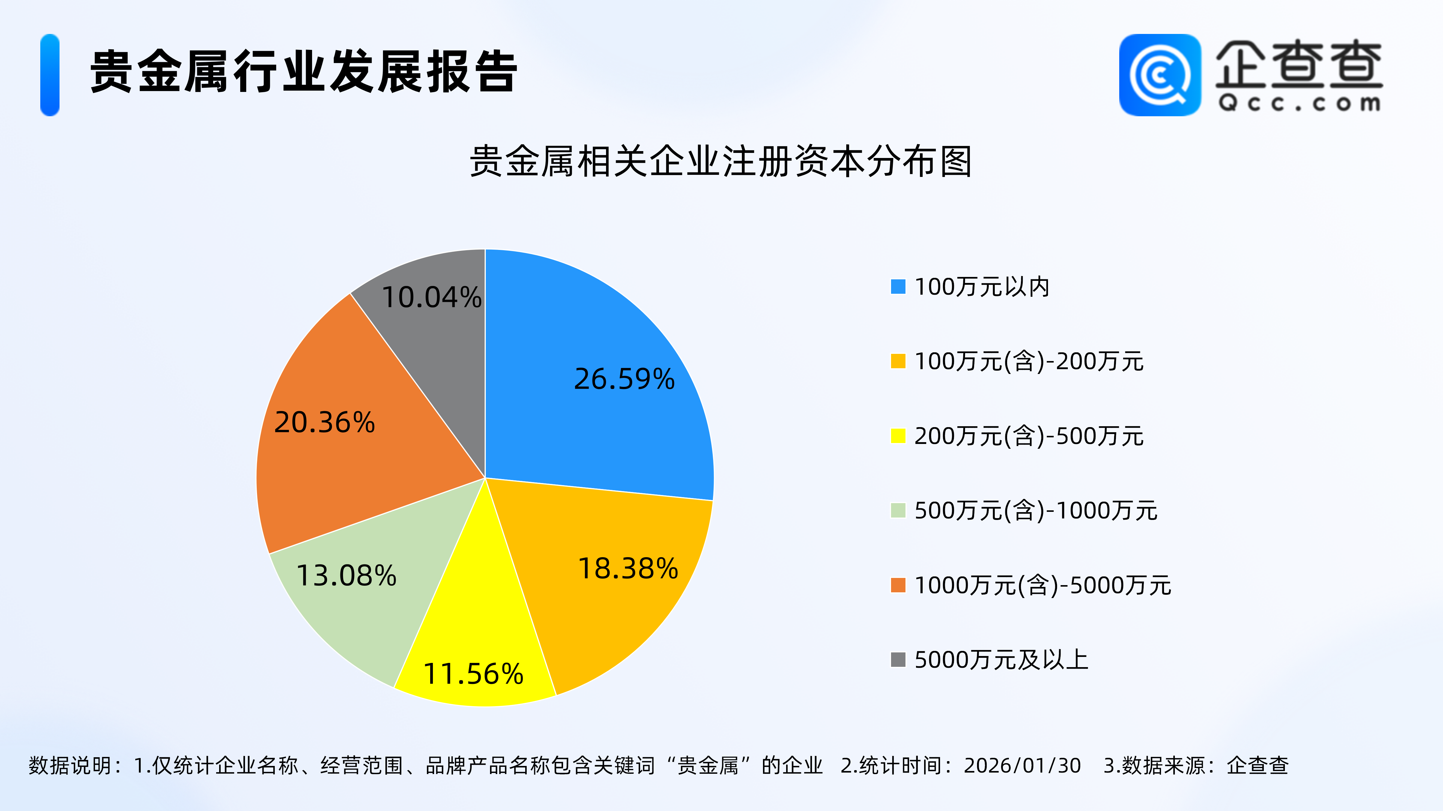 企查查数据显示,从注册资本来看,贵金属相关企业注册资本分布在100万元以内的最多,占比26.59%。注册资本在千万元及以上的相关企业合计占比30.4%,其中注册资本在1000万元(含)-5000万元的相关企业占比20.36%。