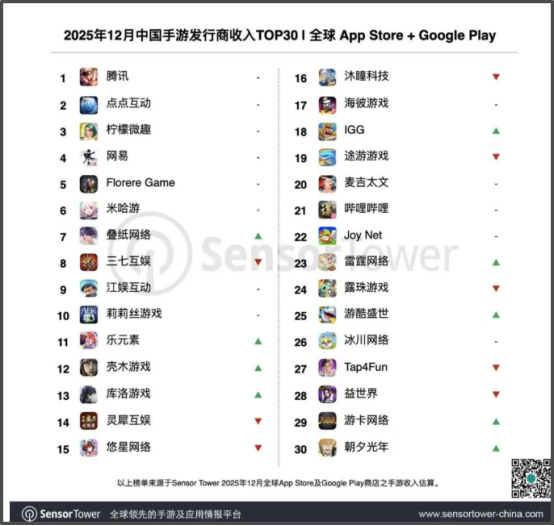 研究机构Sensor Tower公布的2025年12月中国手游发行商全球收入排行榜显示,米哈游已跌至榜单第六位,旗下作品《原神》、《绝区零》则位列榜单的第14位、第19位。