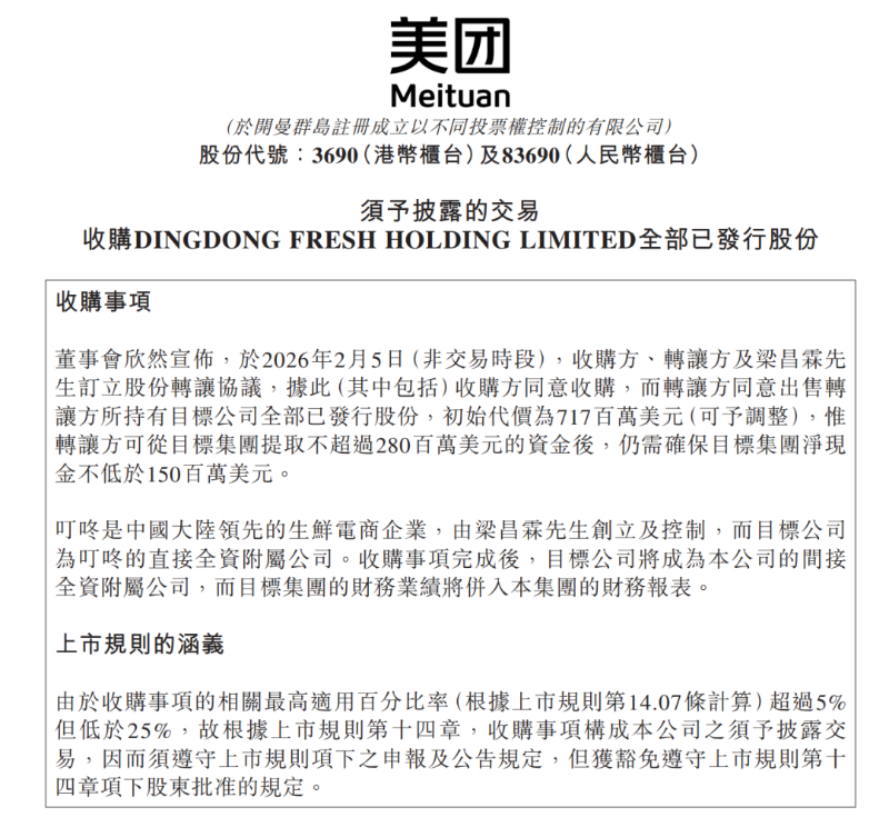 2月5日下午收盘后,美团公告,公司拟以7.17亿美元收购中国大陆领先的生鲜电商企业叮咚的全部已发行股份。